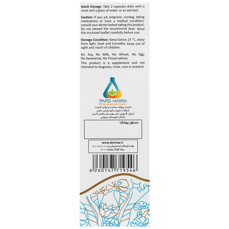 این مکمل فاقد گلوتن، گندم، سویا، شیر، تخم مرغ، شیرین کننده و نگهدارنده است و به صورت جعبه های 30 عددی (3 بلیستر 10 تایی) به بازار عرضه می‌گردد.